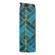 Garrafa Térmica Padrão Dourado e azul sobre fundo verde, costura
