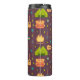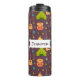 Uma garrafa de água térmica com um padrão temático de acampamento divertido. Colocado sobre um fundo castanho avermelhado. Elementos no padrão incluem uma fogueira, uma tenda, uma guitarra, uma pá e mochila. Personalize com um nome.