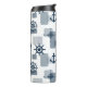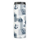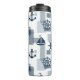 Design marítimo sem costura, com embarcação à vela, bússola, âncora e decoração das rodas de vela em fundo geométrico azul e branco