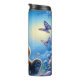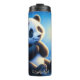 Esta ilustração encantadora apresenta um bebê panda sentado num campo de flores azuis e roxas. O panda veste um grande arco roxo e está rodeado por borboletas fluindo. A iluminação suave, etérea e o fundo luminoso criam uma cena pacífica e caprichosa.