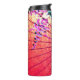 Um parasita rosa e vermelho decorado com flores pintadas e pequenos pássaros azuis. Parece brilhar de dentro.