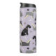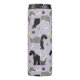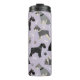 Cães lindos Schnauzer em casacos pretas, salgadas e pimentões e pretas e prateadas, sentados, em pé e rollover com ossos de cão espalhados e estampas de pata sobre fundo roxo leve.