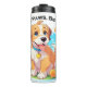 Um tumbler térmico com uma fotografia de um filhote fofo sentado entre as flores. Ele parece muito feliz por estar cercado por flores e borboletas. O presente perfeito para dar àqueles que amam cachorros. Contém conteúdo generativo.