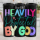 Esta é uma design gráfica vibrante que apresenta a frase "PROTEGIDO PESADAMENTE POR DEUS" em um layout multicolorido e multifonte. O texto é colocado sobre um fundo simples e leve de cinzas. O design usa uma combinação de fontes arrojadas e achatadas para "HEAVILY" e "BY GOD" e um script fluente para "Protected". Cada palavra é renderizada em uma cor clara diferente, e a palavra "Protegida" é acentuada com dois pequenos corações vermelhos. A estética geral é moderna, colorida e transmite uma mensagem de fé e proteção.