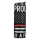 This is a powerful, patriotic design for the father of a firefighter. The central image features a firefighter in full gear, including a helmet and air tank, holding an American flag on a pole. This image is overlaid on a distressed, black and white US flag background. A large, stylized red axe forms the base of the image. The text "PROUD DAD OF A FIREFIGHTER" is split across the top and bottom in a bold, distressed font. A customizable name, "Theodore", is on the left side.