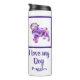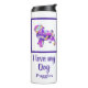 Coloque a silhueta de cachorro de estimação em púrpura, rosa, amarela e azul padrão de abstrato digital. Este tumbler térmico certamente coloca um sorriso em qualquer rosto de amante de cachorro. Além disso, é ecológico, para que ela possa guardar por anos. Mude "Eu amo meu cachorro"/ "Nome" com qualquer texto que você quiser em ambos os lados da garrafa.