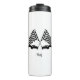 Dois carros de corrida em frente à bandeira com estilo de assinatura