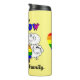 Este Tumbler Térmico apresenta um rebanho de ovelhas mágicas. Há cinco ovelhas brancas e uma com as cores da bandeira LGBTQ. O texto diz: "Sou a ovelha da família." Este design envolve a frente e dois lados do batedor. No verso há um coração com as cores da bandeira do Arco-íris. A cor de fundo pode ser personalizada.