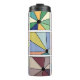 Este humilde térmico tem um desenho abstrato que é feito de nove quadrados com um círculo e "raios" saindo do círculo em muitas cores diferentes.