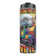 Este desenho animado apresenta um feliz copo vestindo óculos, dirigindo um trem de cor brilhante em uma pista sinuosa. A design inclui o texto espirituoso, "EU NÃO CAMINHO NO TREM LOUCO, EU O DIRIJO", criando um design humorístico e enérgico.