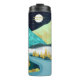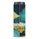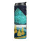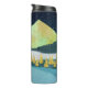 Uma bela paisagem com texturas únicas mostrando um rio e uma paisagem de montanha com lua ascensão e céu estrelado em tons de azul, ouro, verde escuro e amarelo.
