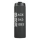 Mantenha suas bebidas prontas com o logotipo do Back Road Rides. Voltas à estrada (BRR) em cinzas claras que aparecem em um fundo escuro.