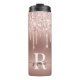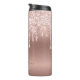 Elegantes e femininos copos térmicos personalizados com letras garrafais em tom rosa bege e dourado com brilho, gotejamento glitter ombre metálico e monograma inicial. Este design apresenta seu primeiro nome em uma linda tipografia de letra manuscrita com rabiscos (ou caligrafia), com inicial em folha metálica ombre falsa rosa bege e dourado rose com borda glamurosa e brilhante com gotejamento glitter. São fáceis de personalizar. Ótimos para presente de casa nova, também para aniversário, casamento, festa de aniversário de 16 anos, chá de noiva, despedida de solteira, festa de formatura. É para a garota que ama coisas únicas e estilosas com brilho.