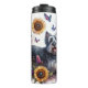 Um Terrier escocês espirituoso com uma expressão feliz está aninhado entre um conjunto colorido de girassóis, peônias cor-de-rosa e borboletas caprichosas. O trabalho de arte captura o charme vivo do terror dentro de um ambiente floral brilhante e alegre.