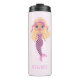 Uma sereia de desenhos animados adorável, com cabelos longos loiros e cor-de-rosa, grandes olhos azuis, e uma sereia rosa balança a cauda. Personalize com um nome.