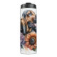 Um sanduíche digno, com expressão suave e sua língua levemente para fora, se situa pacificamente entre um belo arranjo de girassóis de tona quente e grandes roxas. As sutis impermeabilizantes no fundo adicionam um toque artístico e calmante a este delicado retrato canino.