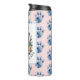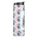 Gato de brindle de cinza de aquarela, cômoda, rodeado de flores rosa e azuis. Em segundo plano, a pata azul-aquática do gato é impressa.