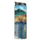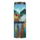 Uma bela paisagem com cores e texturas únicas mostrando uma paisagem de montanha e lago e uma floresta multicolorida com um sol ascensão e um alce em tons de azul, verde, ouro e magenta.