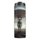 A lone astronaut beneath a surreal sky. This thermal mug features a digital scene of otherworldly stillness, where a UFO floats like a fractured Earth-half planet, half dripping terrain. A journey through space and imagination.