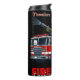 This is a fun and whimsical design featuring a T-Rex dinosaur dressed as a firefighter. The T-Rex is wearing a helmet and gear and is actively aiming a fire hose while riding in the back of a classic red fire truck. The playful wordplay "FIRESAURUS" is prominently displayed below the truck. A potential placeholder name, "Theodore", is at the top of the image. The entire image has a humorous, cartoonish style against a black background.
