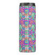 Tall travel mug with a vibrant, symmetrical floral pattern in bright pink, blue, and green hues. The design exudes a lively, playful feel.