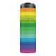Ein Thermosbecher mit Streifen in den Farben des Regenbogens mit Schriftzug nach Wahl.