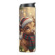 This is an incredibly charming and heartwarming digital illustration featuring a trio of fluffy, baby Highland cows (Coos), dressed in classic Christmas attire. The scene is set in a magical, snowy forest, illuminated by a sparkling background of golden bokeh lights.