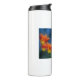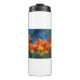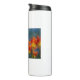 Um design de arte digital de tulipas laranja e amarelas em um estilo mosaico circular. As cores das flores contrastam bem com o céu azul.