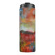 Linda arte de aquarela do outono desenhando em um tumbler térmico. Cor vermelha, marrom, azul, verde.