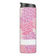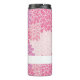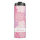 Tumbler térmico bonito, com um teste padrão cor-de-rosa e branco estilizado do crisântemo. Personalize o texto cor-de-rosa, na banda branca, através da parte inferior, para ler o que você quer. Grande ideia do presente para ela.