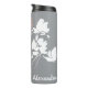 Moderna cor d'água colorida e flores de tinta e folhas sobre fundo de cor de cinza, tumbler térmico. Recursos, espaço modelo de solteiro de de em script branco para nome ou iniciais.