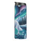 Esta bela ilustração mostra um lobo branco e místico caminhando através de um lago congelado coberto de cristais de gelo. A cena é colocada sob um céu noturno majestoso cheio de aurora borealis, duas luas, e uma lua de cheio. A arte tem um forte, espiritual, e um sentimento fantástico, perfeito
