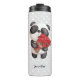 Tumbler térmico com um desenho de aquarela adorável. Um adorável urso panda preto e branco carregando um buquê de rosas. Cinza com fundo branco de bolinhas.