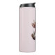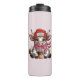Uma adorável vaca de desenho animado sentada bebendo um café gelado através de um canudo. Ela tem manchas marrons e brancas, um lenço rosa e botas marrons. Em sua cabeça repousa um gorro vermelho com as palavras “Viciada em Café” escritas nele.
