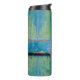 GARRAFA TÉRMICA VISÃO DE FECHAMENTO DA PORTA DE MADEIRA AZUL E VER