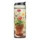An illustration of a black and white cat sitting on a flower filled window sill illustration tumbler for those that love their tuxedo cats.
