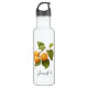 Uma garrafa de água com desenho aquoso de 3 damascos laranja pendurados num pequeno galho castanho coberto de folhas verdes. Tem um olhar botânico antigo.