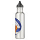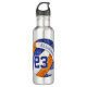Esta equipe personalizada colore a garrafa de água esportiva de vôlei para meninas apresenta um gráfico de vôlei azul, laranja e branco que tem um padrão caleidoscópico floral feminino misturado com os painéis de vôlei azul e laranja e um padrão de espiral de abstrato misturado com os painéis brancos - seu nome e número de camisa são personalizáveis em azul de coordenação - por katz_d_zynes