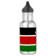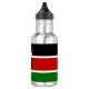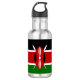 Design com bandeira da República do Quénia com faixas pretas, brancas, vermelhas e verdes com emblema constituído por duas lanças brancas e pelo escudo Masai tradicional