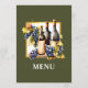 Três garrafas de vinho a aquarela descansam sobre um conselho de madeira que contém cachos de uvas vermelhas com folhas de videira. O gráfico é enquadrado por uma camada quadrada branca, revestida de ouro falso e pop contra fundo de floresta/verde-oliva. O inverso é um azul escuro com modelos brancos para suas escolhas de comida personalizadas. Este cardápio é ideal para qualquer festa de queijo e coquetel de vinho; para um casamento de adega / vinhedo / fazenda de vinho ou um aniversário ou festa de aposentadoria no exterior de um país rústico.