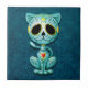 Este design azul adorável do gatinho é decorado com redemoinhos e padrões de ponto delicados. A flor amarela pedals círculo os olhos roxos puros na tradição do dia dos crânios inoperantes do açúcar. O gato está sentando-se para baixo, olhando para a frente com sua cauda que acena no fundo. A cabeça desproporcionado senta-se em um corpo minúsculo que crie um brincalhão, desenhos animados como a aparência. Uma estrela de cinco pontos senta-se no meio da testa do gatinho quando um coração vermelho e amarelo brilhante aparecer no centro da caixa. Uma sombra cai no fundo azul profundo que faz o design parece flutuar apenas acima da superfície deste azulejo. O gato pequeno bonito é um divertimento e um design à moda inspirados pelos padrões bonitos do dia dos crânios inoperantes do açúcar.