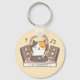 Chaveiro com rabisco fofo de gato com manchas laranja e castanhas. Está coçando a máquina misturável com sua pata e vestindo um fone de ouvido como um jóquei em disco. Humorística pegue a técnica de rascunho dj. Para músicas, amantes do clube e do gato. A cor de fundo pode ser alterada.