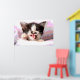 Fotografia de um gatinho preto e branco numa caixa revestida com material de linho, subindo e mostrando seus dentes e unhas ao espectador em defesa, efeito de Poster