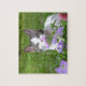 Tigre bonito e gatinho branco e petúnias rosa/roxo neste quebra-cabeça