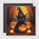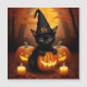 Gatinho Preto em Chapéu de Bruxa entre Abóboras de