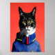 Retrato de um gato bombeiro bonitinho e adorável em um fundo vermelho. Esta é uma arte gerada por IA.