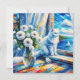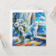 Imagem de um gato branco olhando pela janela em um veleiro no oceano. Na frente do gato está um vaso de vidro de flores brancas. Isto é feito no estilo de pintura a óleo. Arte costeira bonito para casa de praia ou para lhe dar aquela sensação de brisa oceânica.