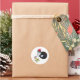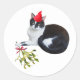 Um gato preto e branco vestindo um boné vermelho segura um erro nesse adesivo colorido de feriado.