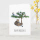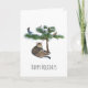 Um gato de mesa segura um cheio de árvore de Natal de aves selvagens neste cartão "Feliz Feriados".