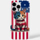 Um adorável gatinho vermelho, branco e azul senta-se à frente e no centro, envolto em listras e estrelas ousadas da bandeira americana. Este design lúdico e de alto contraste reúne a energia de um animal de estimação fofo e o orgulho patriótico, tornando-o um acessório de destaque para qualquer pessoa que ame gatinhos, o país ou ambos.